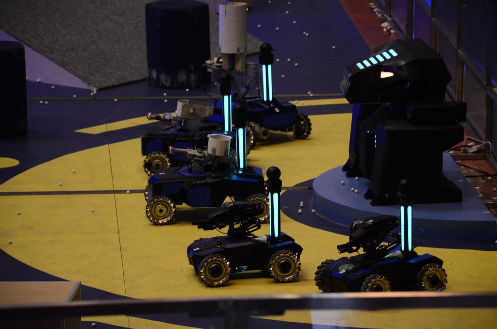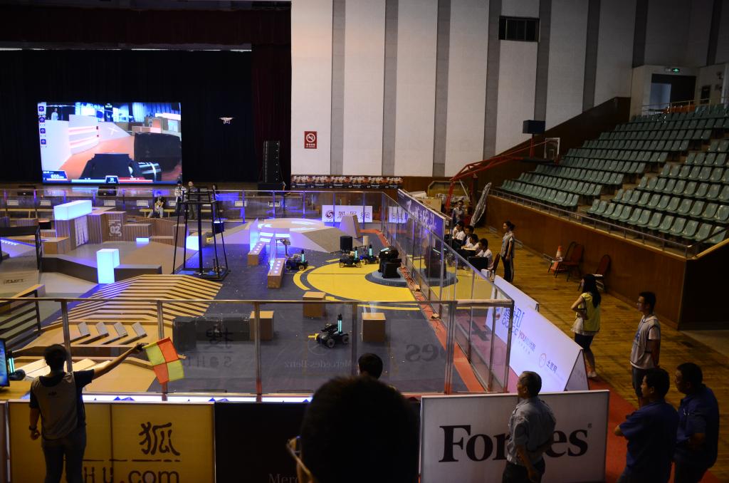 競賽隊伍分為紅、藍兩方,雙方均有6個機器人組成各自戰(zhàn)隊,包括1個炮手(裝備大口徑彈丸負責重型打擊),2個射手(負責機動打擊),2個騎兵(負責偵查和輕型打擊),1個哨兵(負責觀察敵情)。參賽隊員們通過高清視頻遠程遙控,操控機器人戰(zhàn)隊在一個設計制作了瞭望塔、戰(zhàn)壕、橋梁、洞穴和樓宇的模擬作戰(zhàn)場地中,完成機動行走、跨越障礙、埋伏狙擊等復雜動作,并要在行動中使用機炮實施打擊,降低對手“生命值”(機器人身后附帶的可視血條裝置),成功攻占其基地的一方勝出。同時還要完成自身的子彈補給、“生命值”補充等任務。