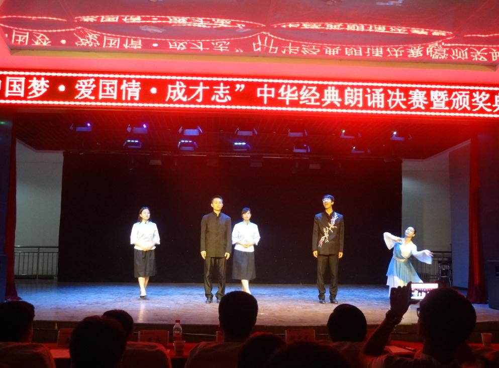 由校團(tuán)委、校學(xué)生會聯(lián)合主辦,歷時2個月的我?!爸袊鴫?,愛國情,成才志”中華經(jīng)典誦讀比賽于5月23號圓滿畫上句號。