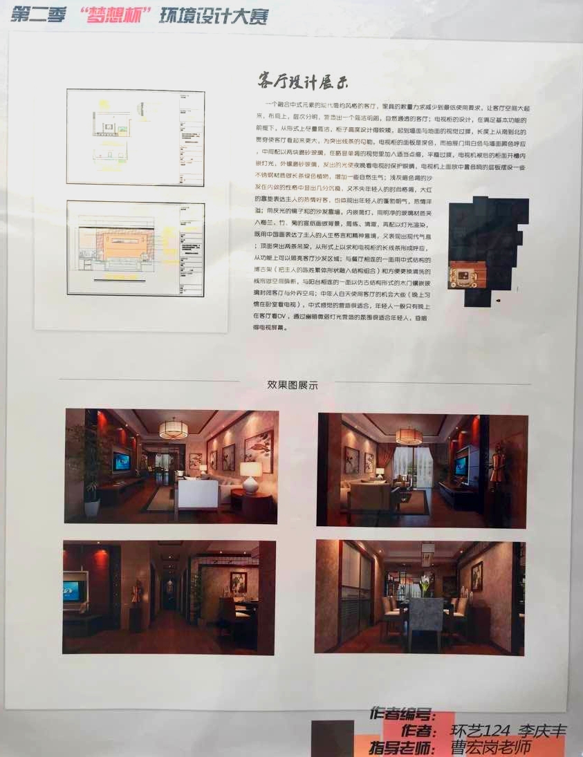 本次大賽由校工會(huì)、校團(tuán)委、設(shè)藝學(xué)院主辦,旨在為陜科大第二期教職工住宅戶(hù)主提供裝修方案,以功能性和人性化為設(shè)計(jì)重點(diǎn),同時(shí)兼顧滿(mǎn)足教職工對(duì)室內(nèi)裝潢的審美需求,著力體現(xiàn)科大學(xué)生的主人翁精神和設(shè)計(jì)素養(yǎng)。自去年年底大賽啟動(dòng)以來(lái),共計(jì)布展120幅裝修方案,展出70余天,已被教職工采納的方案14套,獲獎(jiǎng)方案17套。一等獎(jiǎng)代表作品二等獎(jiǎng)代表作品 經(jīng)過(guò)專(zhuān)業(yè)評(píng)審組的合議,設(shè)藝學(xué)院環(huán)藝專(zhuān)業(yè)2011級(jí)黃志堅(jiān)、林雙蜜組合的180平米現(xiàn)代中式風(fēng)格裝修方案憑借極具震撼的視覺(jué)效果、實(shí)用時(shí)尚的設(shè)計(jì)思路、飽含傳統(tǒng)元素的設(shè)計(jì)理念獲得總冠軍,最終捧得“夢(mèng)想杯”;2012級(jí)學(xué)生楊惠的100平米簡(jiǎn)約現(xiàn)代風(fēng)格、李慶豐的140平米現(xiàn)代中式風(fēng)格、周斯昊的180平米現(xiàn)代中式風(fēng)格獲得亞軍;符益東的100平米北歐風(fēng)格、雍錦軒的120平米現(xiàn)代簡(jiǎn)約風(fēng)格、孫鈺瑩的140平米簡(jiǎn)約田園混搭裝修方案獲得季軍。張?jiān)降仁麑W(xué)生獲得了優(yōu)秀獎(jiǎng)。 作為設(shè)藝學(xué)院“畫(huà)筆點(diǎn)綴青春,設(shè)計(jì)服務(wù)校園“的系列品牌活動(dòng)之一,第二屆“夢(mèng)想杯”為陜科大教職工提供了符合居住需求的設(shè)計(jì)方案亦鍛煉了同學(xué)們的專(zhuān)業(yè)能力,起到了促進(jìn)學(xué)風(fēng)、提振士氣的作用,也符合學(xué)院結(jié)合專(zhuān)業(yè)開(kāi)展校園文化活動(dòng),解決實(shí)際問(wèn)題的工作思路。頒獎(jiǎng)現(xiàn)場(chǎng)環(huán)藝教研室?guī)熒硎荆骸皦?mèng)想杯”讓更多同學(xué)感受到了環(huán)藝設(shè)計(jì)的獨(dú)特以及艱辛,每個(gè)精美的方案都來(lái)之不易。設(shè)藝學(xué)院執(zhí)行院長(zhǎng)詹秦川在總結(jié)中客觀地對(duì)本屆夢(mèng)想杯做出了點(diǎn)評(píng),指出此次活動(dòng)的設(shè)計(jì)水準(zhǔn)距離高標(biāo)準(zhǔn)還有一定差距,設(shè)計(jì)不僅要滿(mǎn)足一般市場(chǎng)的審美需求,更要盡力得到專(zhuān)業(yè)人士的認(rèn)可,教研室老師應(yīng)該進(jìn)一步發(fā)揮校園活動(dòng)第二課堂的功能,只有在實(shí)踐中教學(xué)方能提升育人的質(zhì)量。(責(zé)任編輯:杜楊 學(xué)生編輯:張寧)