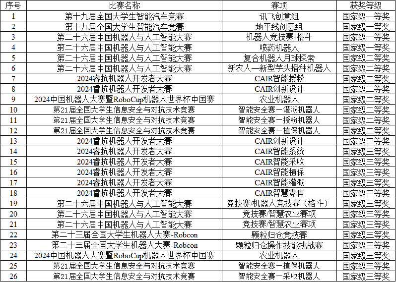 2024年,在學(xué)校教務(wù)處的大力指導(dǎo)下,我校師生在第十九屆全國(guó)大學(xué)生智能汽車(chē)競(jìng)賽、第二十六屆中國(guó)機(jī)器人與人工智能大賽、2024睿抗機(jī)器人開(kāi)發(fā)者大賽、第二十六屆中國(guó)機(jī)器人與人工智能大賽、第二十三屆全國(guó)大學(xué)生機(jī)器人大賽(Robcon)、第21屆全國(guó)大學(xué)生信息安全與對(duì)抗技術(shù)競(jìng)賽和2024中國(guó)機(jī)器人大賽暨RoboCup機(jī)器人世界杯中國(guó)賽中再創(chuàng)佳績(jī),累計(jì)獲全國(guó)一等獎(jiǎng)4項(xiàng)、二等獎(jiǎng)8項(xiàng)、三等獎(jiǎng)14項(xiàng),省級(jí)獎(jiǎng)項(xiàng)39項(xiàng)。