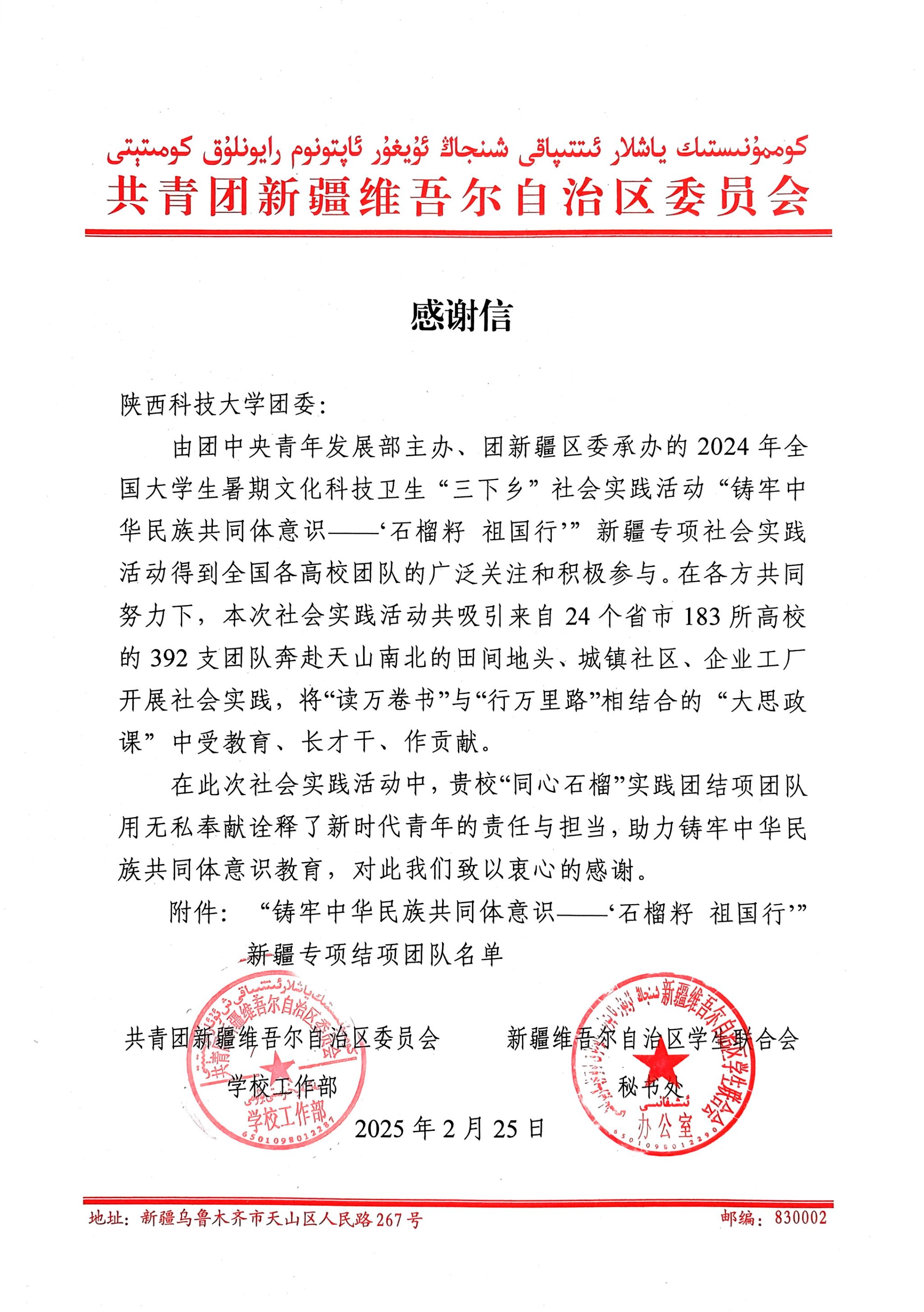 近日,共青團(tuán)新疆維吾爾自治區(qū)委員會(huì)向我校發(fā)來(lái)感謝信,對(duì)我校經(jīng)管學(xué)院“同心?石榴”實(shí)踐團(tuán)在“鑄牢中華民族共同體意識(shí)——‘石榴籽 祖國(guó)行’”新疆專項(xiàng)社會(huì)實(shí)踐活動(dòng)中的突出表現(xiàn)予以表?yè)P(yáng)和感謝。