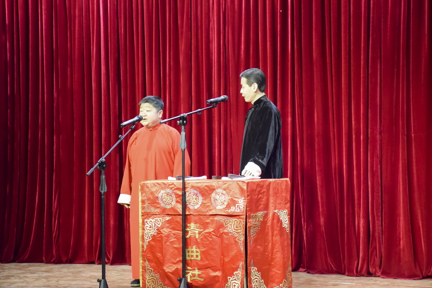 演出結(jié)束后,青曲社大秦老師介紹說,青曲社從成立的第一天起便開始了“傳統(tǒng)曲藝進(jìn)校園”的活動(dòng),建社之初這樣做主要考慮的是缺乏場地表演的原因,而在青曲社壯大發(fā)展之后仍然堅(jiān)持這樣做是為了更好的尋找優(yōu)秀相聲人才,同時(shí)來正確引導(dǎo)當(dāng)代大學(xué)生對傳統(tǒng)相聲的了解、學(xué)習(xí)和發(fā)揚(yáng)。而在校園進(jìn)行演出與平場劇場演出相比,大學(xué)生觀眾更為熱情,這一定程度上也成為青曲社繼續(xù)進(jìn)行“校園行”活動(dòng)的動(dòng)力之一。
