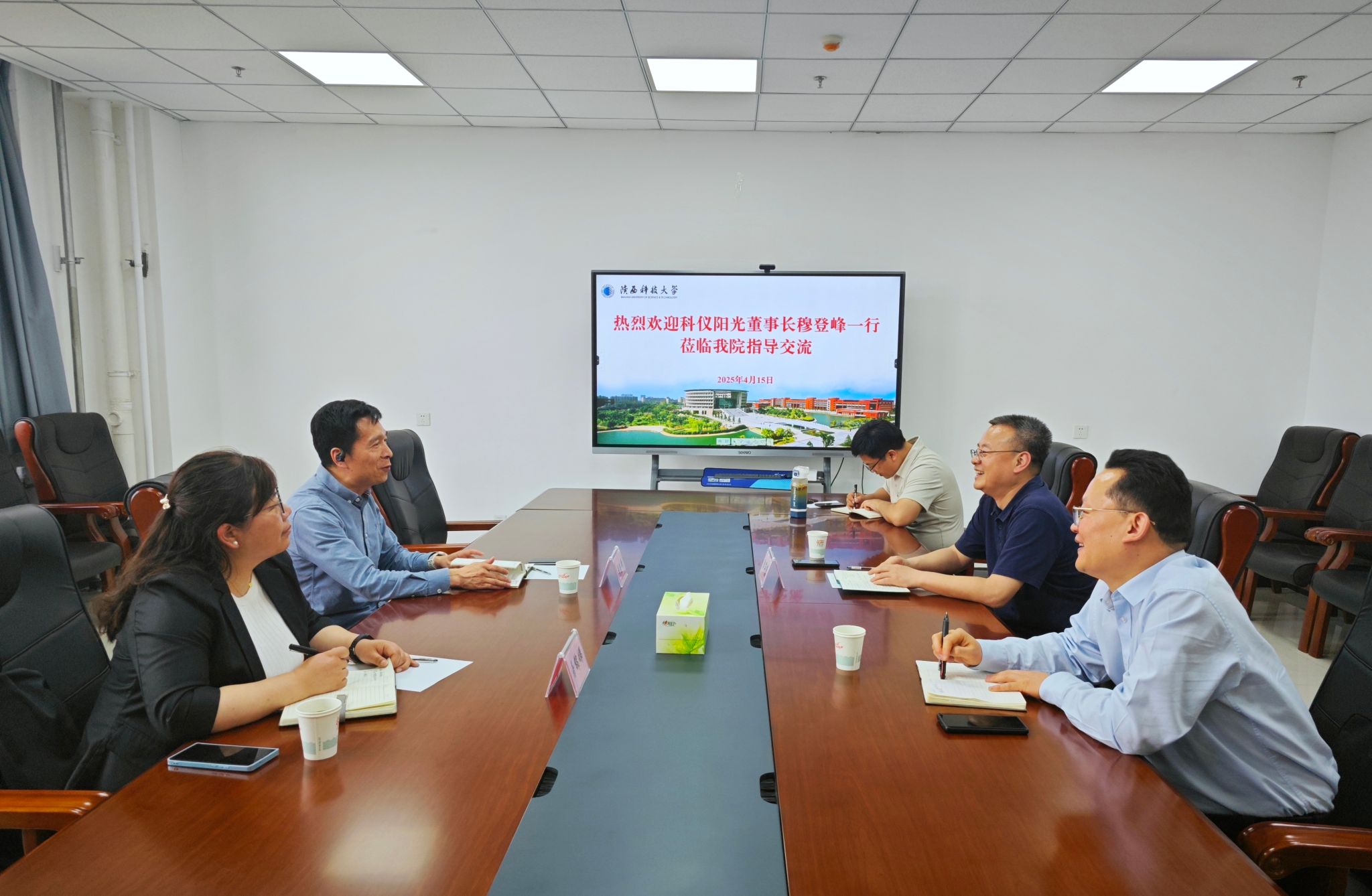 郭軍康對(duì)穆登峰一行的到來(lái)表示熱烈歡迎,并從學(xué)院發(fā)展歷程、科學(xué)研究、人才培養(yǎng)、師資隊(duì)伍、社會(huì)服務(wù)等方面對(duì)學(xué)院的基本情況做了介紹,希望通過(guò)開(kāi)展務(wù)實(shí)合作,實(shí)現(xiàn)資源互補(bǔ),助推環(huán)境治理關(guān)鍵技術(shù)新突破、提升人才培養(yǎng)質(zhì)量力促畢業(yè)生高質(zhì)量就業(yè),更好服務(wù)地方經(jīng)濟(jì)社會(huì)發(fā)展。穆登峰介紹了科儀陽(yáng)光公司概況,他認(rèn)為陜科大及環(huán)境學(xué)院近年來(lái)積極發(fā)展、主動(dòng)作為的精神令人欽佩,期待雙方盡快確定合作細(xì)分領(lǐng)域、建立機(jī)制,助力人才培養(yǎng)精準(zhǔn)化,實(shí)現(xiàn)校企跨界融合。交流中,雙方在開(kāi)展實(shí)踐教學(xué)、共編教材、項(xiàng)目聯(lián)合研發(fā)、學(xué)生聯(lián)合培養(yǎng)、畢業(yè)生實(shí)習(xí)就業(yè)等方面達(dá)成合作框架,為進(jìn)一步深化合作奠定了堅(jiān)實(shí)基礎(chǔ)。