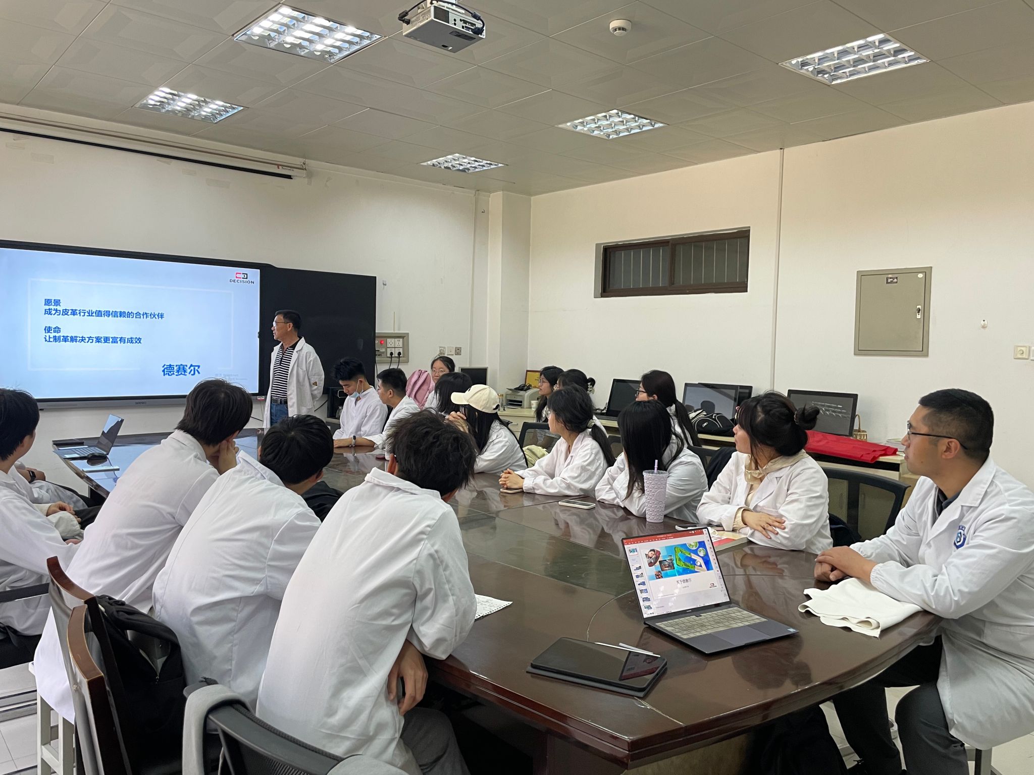4 月 18-20 日,輕工科學(xué)與工程學(xué)院皮革系特邀四川德賽爾新材料科技有限公司開展技術(shù)交流與演示活動(dòng),該公司水場(chǎng)技術(shù)主管吳仲蓬經(jīng)理與校內(nèi)指導(dǎo)教師一起,指導(dǎo)了輕化工程專業(yè) 22 級(jí)學(xué)生的制革濕整飾實(shí)驗(yàn),并進(jìn)行了無鉻鞣技術(shù)交流與演示活動(dòng)。此次活動(dòng)讓學(xué)院師生深入了解了制革的前沿技術(shù),同時(shí)也 拓展了專業(yè)視野。 在專題講座環(huán)節(jié),吳仲蓬經(jīng)理以《德賽爾DWT/CFW無鉻鞣體系》為題, 介紹了四川德賽爾新材料科技有限公司的基本概況和該公司 DWT/CFW 無鉻鞣體系的技術(shù)特點(diǎn)。通過豐富、詳實(shí)的講解,讓師生們?nèi)媪私饬四壳笆袌?chǎng)主流無鉻鞣技術(shù)的特點(diǎn)、應(yīng)用領(lǐng)域和發(fā)展趨勢(shì)。