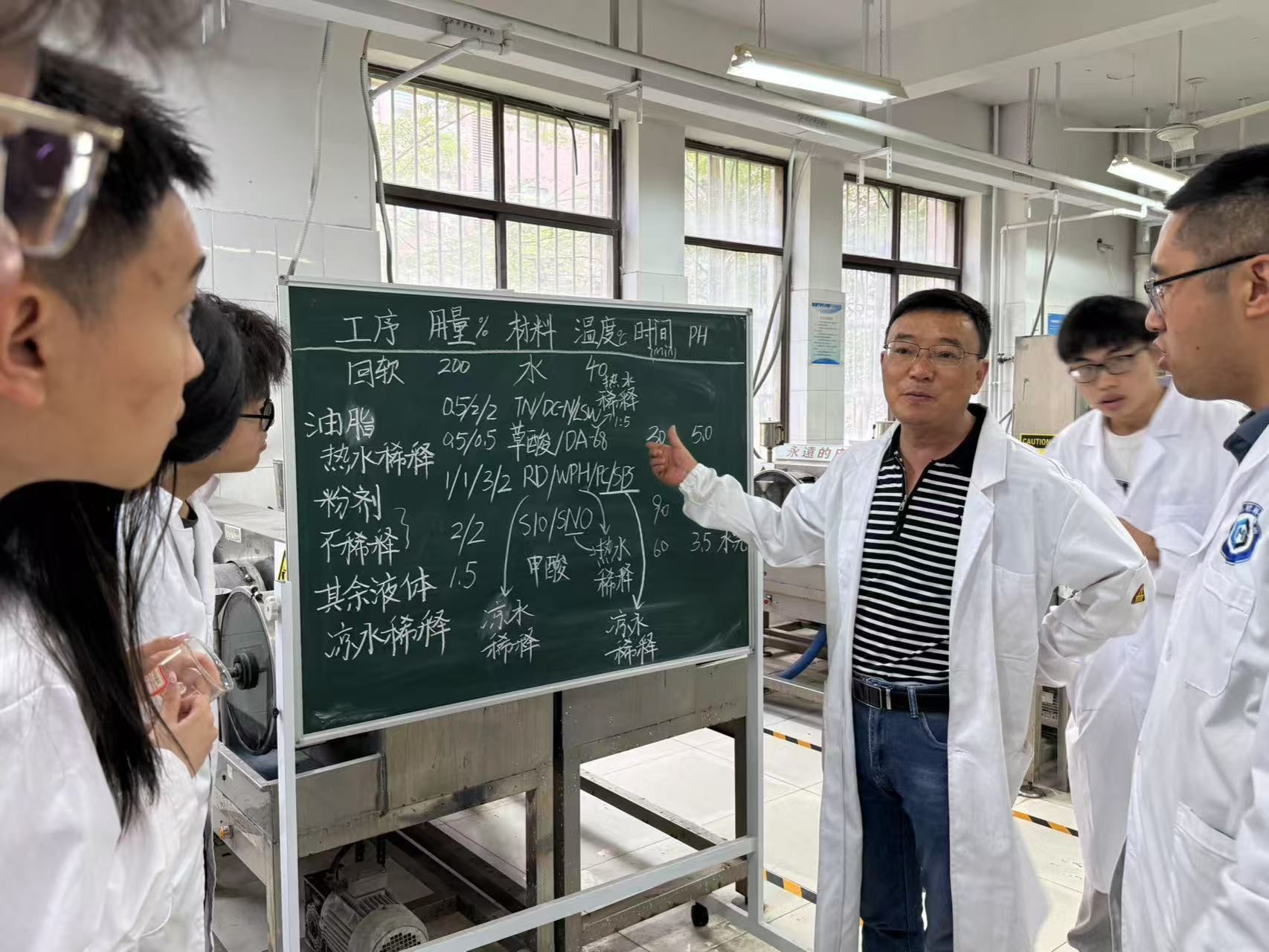 在實(shí)驗(yàn)教學(xué)環(huán)節(jié),吳經(jīng)理和指導(dǎo)教師一起指導(dǎo)學(xué)生開展了綿羊皮服裝革無鉻鞣工藝實(shí)驗(yàn)。實(shí)驗(yàn)開始前,指導(dǎo)老師向?qū)W生們講解所使用濕整飾工藝中各類 化料的作用原理、控制要點(diǎn)、操作方法和注意事項(xiàng)。實(shí)驗(yàn)過程中,專業(yè)師生一起進(jìn)行了回軟、復(fù)鞣、水洗、加脂和套色等一系列濕整飾實(shí)驗(yàn)。為了讓學(xué)生們更直觀地感受不同材料的特性,采用分組試驗(yàn)對(duì)比的實(shí)驗(yàn)方式,讓學(xué)生們深度了解鈦白粉、黃色染料等不同材料的應(yīng)用效果差異。