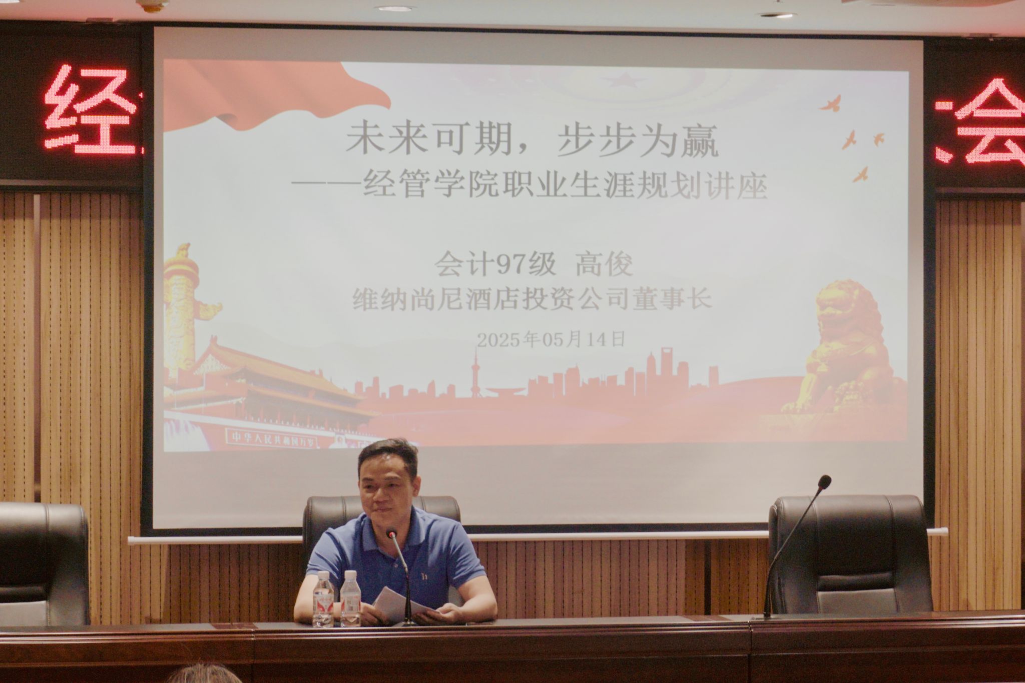 為推動經(jīng)管學(xué)院就業(yè)工作,提升經(jīng)管學(xué)子職業(yè)生涯規(guī)劃意識,明晰職業(yè)發(fā)展路徑。5月14日,學(xué)院特邀優(yōu)秀校友會計專業(yè)97級高俊做題為《未來可期,步步為贏—經(jīng)管學(xué)院職業(yè)生涯規(guī)劃》講座。會計系相關(guān)老師、就業(yè)輔導(dǎo)員、畢業(yè)生及低年級學(xué)生代表120余人參加本次講座。