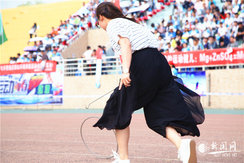 大學(xué)生組男女混合滾鐵環(huán)項(xiàng)目于上午8:35舉行,共10隊(duì)分兩組舉行,選手來回接力滾鐵環(huán),鐵環(huán)掉落或者亂道都會(huì)導(dǎo)致名次落后。選手們來回穿梭,鐵環(huán)快速旋轉(zhuǎn)沖向終點(diǎn)。一名比賽完的女同學(xué)說:“盡管我鐵環(huán)掉落,但是我還是必須重新出發(fā),奔向終點(diǎn)?!边@種趣味性的項(xiàng)目同樣體現(xiàn)著堅(jiān)持不懈的體育精神。最終,機(jī)電學(xué)院榮獲第一名。