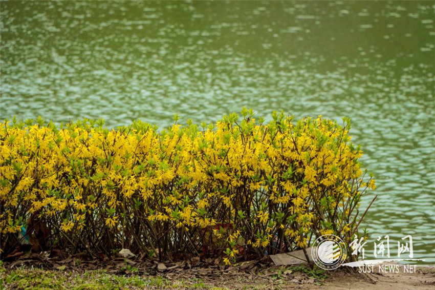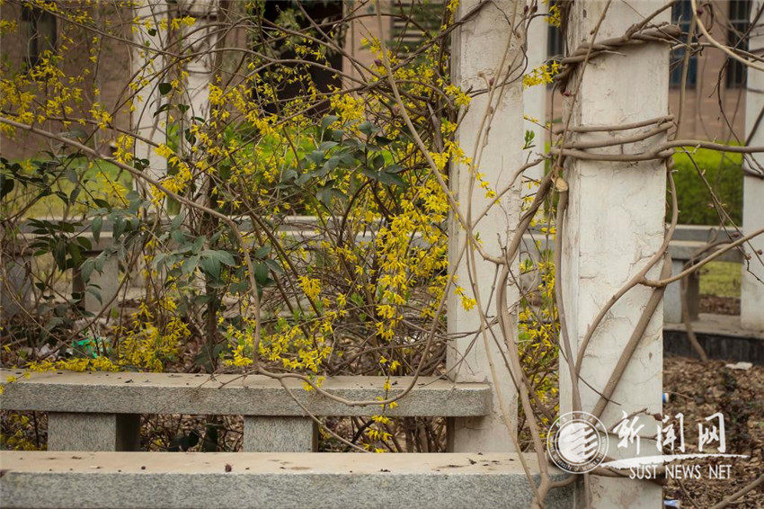 即使枯藤叢生,迎春花也執(zhí)著地要給校園添上一抹春色。