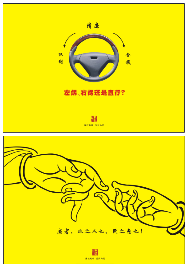 作品簡(jiǎn)介:圖1運(yùn)用常見(jiàn)的汽車(chē)方向盤(pán),通過(guò)方向的選擇來(lái)表達(dá)主題;圖2“廉者,政之本也,民之惠也!”出自《晏子春秋》,指廉潔是從政之本,可為民謀福利。兩只手的寓意形象地表達(dá)了為官者,只要廉政勤政,愛(ài)民為民,必定官民融洽,社會(huì)和諧!