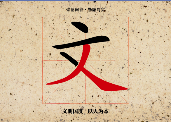 作品簡(jiǎn)介:以“文明”為主題,從“文”字提煉思路,“文”離不開(kāi)人,以人為本、人有文明,國(guó)家和社會(huì)才能文明,倡導(dǎo)“文明國(guó)度,以人為本”的理念。