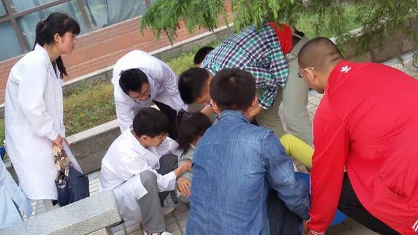 "快!快!快點(diǎn)啊!"一名穿著白大褂的女孩站在F座樓下焦急的呼喊著,五六個(gè)救護(hù)人員聞聲跑到現(xiàn)場(chǎng),發(fā)現(xiàn)一名女生匍匐在地,面色蒼白。救護(hù)人員讓周?chē)鷩^的人群散開(kāi),其中一位醫(yī)生趕忙跪在地上將該女生的身體翻轉(zhuǎn)過(guò)來(lái),立即對(duì)她實(shí)施了胸外心臟按壓,一會(huì)兒之后,病人被抬上擔(dān)架迅速轉(zhuǎn)運(yùn)到校醫(yī)院進(jìn)行進(jìn)一步治療。