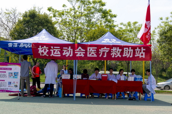 處理完這些之后,幾名醫(yī)護(hù)人員又趕回了熱鬧的運(yùn)動(dòng)場(chǎng),這里有一個(gè)藍(lán)色的帳篷,里面配備有氧氣袋、擔(dān)架和醫(yī)療救助箱等救援器材,隨時(shí)準(zhǔn)備救助賽場(chǎng)上受傷的運(yùn)動(dòng)員和觀眾。這是由校醫(yī)院和匯海基金會(huì)聯(lián)合成立的一支醫(yī)療救助隊(duì),除了一名醫(yī)生和一名護(hù)士,其余的15個(gè)人都是匯?;饡?huì)的大學(xué)生志愿者。從去年開(kāi)始,他們就成為運(yùn)動(dòng)會(huì)的駐場(chǎng)組織,還會(huì)不定期派人在賽場(chǎng)上巡邏,以便及時(shí)為師生們提供醫(yī)療救助服務(wù)。