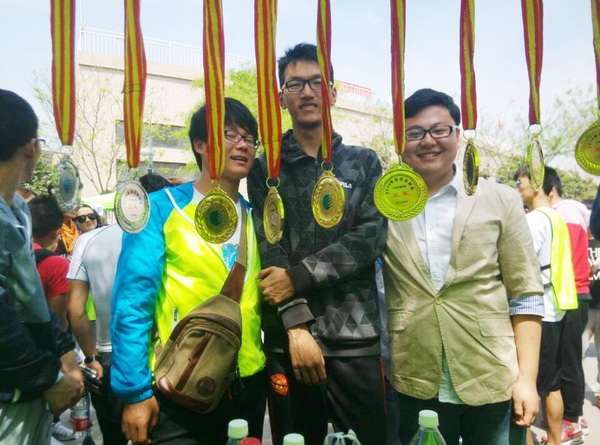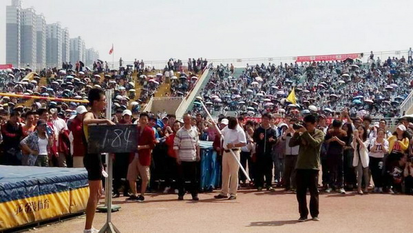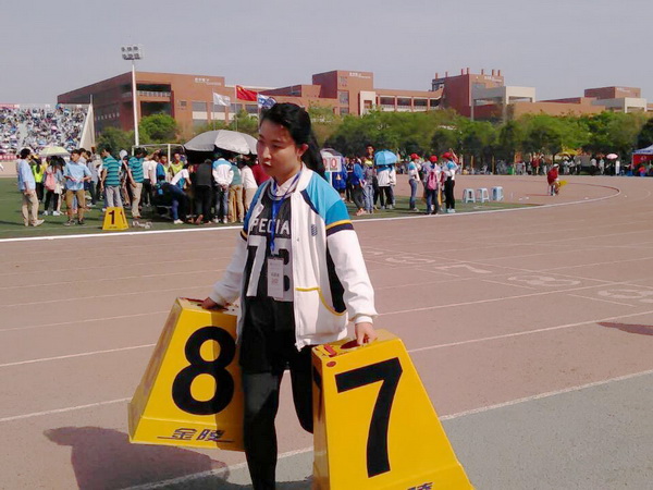 在現(xiàn)場觀眾的熱烈掌聲中,“新科狀元”陳賢星與寫有“1.84”數(shù)字的黑色記錄牌“甜蜜”地合影,讓鏡頭定格在這一輝煌的時刻。這位看起來瘦削的輕工學院包裝141班的男生,身高193cm,曾在高中時就獲得過重慶市男子跳高比賽的冠軍。同樣的,他對三級跳遠也頗感興趣,在本屆運動會男子三級跳遠決賽中,又以13.45米的成績再次打破校運會記錄。