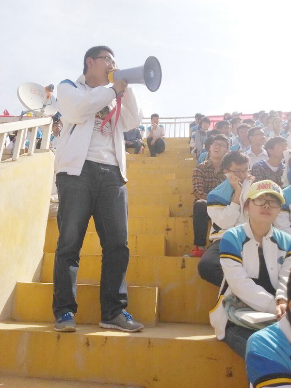 同學們頂著驕陽,穿著校服有序地坐在看臺上,眼睛齊刷刷地盯著同一個目標——導員。他面向大家,發(fā)出鏗鏘有力的聲音:“比賽即將開始,你們要注意代表咱們學院的運動員,等他們沖刺過來時,大家一定要為他們吶喊助威。我知道今天炎熱依舊,但為了向那些在烈日下仍然拼搏的同學們,我們要做他們的堅強后盾,要讓他們感受到我們的熱情和真誠,大家一定要堅持下去!”發(fā)話完畢,導員一個轉(zhuǎn)身,無視毒辣的日光照射,屹立在看臺上,時而用嚴肅面孔、沉默不語之態(tài)維護現(xiàn)場的秩序,時而指揮同學們,一鼓作氣地加油助威。