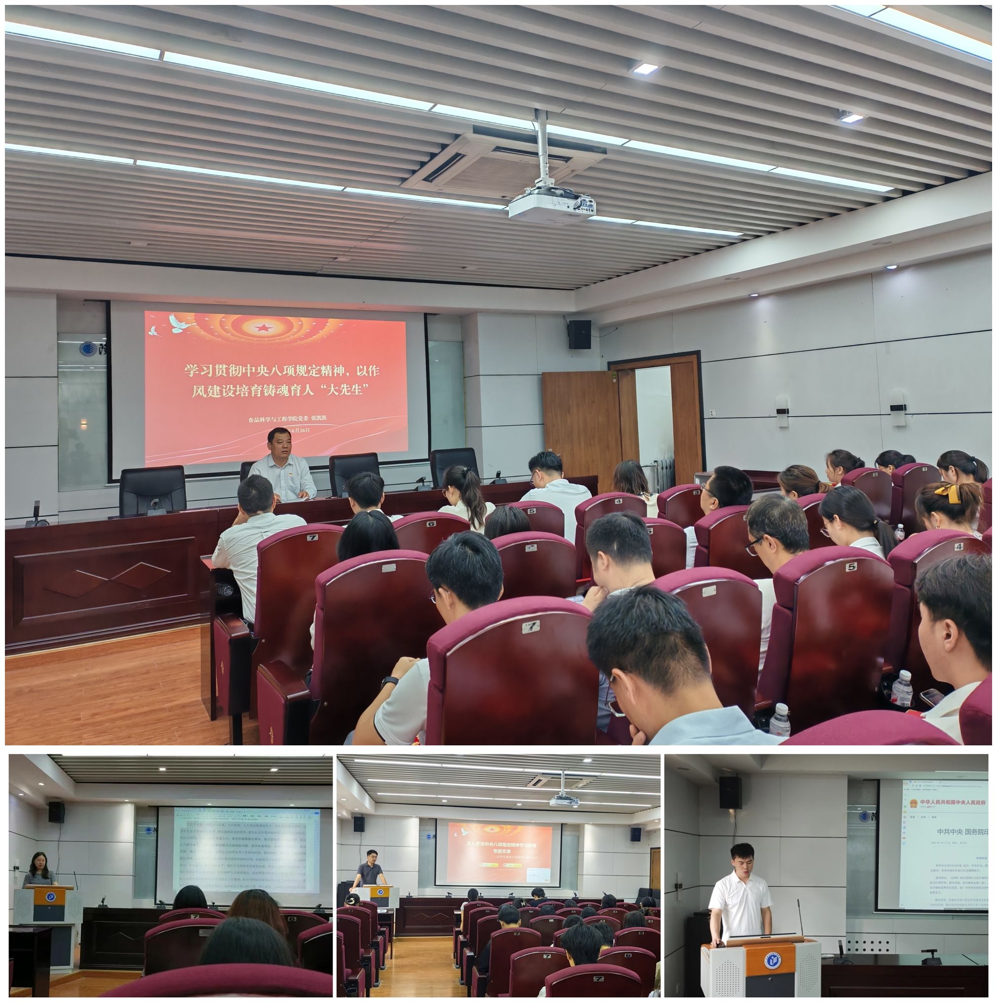 七一前夕,學(xué)院領(lǐng)導(dǎo)班子和各師生黨支部書記分別講授深入貫徹中央八項(xiàng)規(guī)定精神學(xué)習(xí)教育專題黨課。學(xué)院黨委書記張凱凱以《深入學(xué)習(xí)貫徹中央八項(xiàng)規(guī)定精神,以作風(fēng)建設(shè)培育鑄魂育人“大先生”》為題進(jìn)行授課,系統(tǒng)闡釋了教育領(lǐng)域踐行中央八項(xiàng)規(guī)定精神的重要意義。學(xué)院黨委委員、各師生黨支部書記圍繞深入貫徹中央八項(xiàng)規(guī)定精神學(xué)習(xí)教育心得體會(huì),結(jié)合分管領(lǐng)域工作及支部特點(diǎn)講授專題黨課,持續(xù)推動(dòng)中央八項(xiàng)規(guī)定精神在食品學(xué)院落地見效.