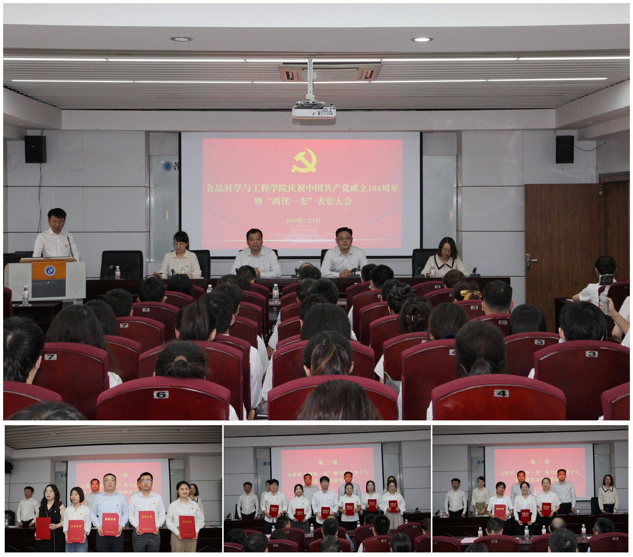 7月1日,學(xué)院召開慶祝中國共產(chǎn)黨成立104周年暨“兩優(yōu)一先”表彰大會(huì),對(duì)劉江花等優(yōu)秀共產(chǎn)黨員、優(yōu)秀黨務(wù)工作者以及先進(jìn)黨支部代表頒獎(jiǎng),大會(huì)號(hào)召全體黨員,以習(xí)近平新時(shí)代中國特色社會(huì)主義思想為指導(dǎo),聚焦教育教學(xué)各項(xiàng)工作,以昂揚(yáng)的斗志、務(wù)實(shí)的作風(fēng),充分發(fā)揮黨支部的戰(zhàn)斗堡壘作用和黨員的先鋒模范作用,凝聚全院師生的智慧與力量,為建成國內(nèi)一流學(xué)院和學(xué)校沖刺“雙一流”建設(shè)目標(biāo)貢獻(xiàn)更大“食品力量”。