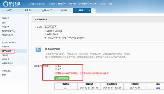 如果有用戶使用電腦或者手機app的客戶端收取郵件,可以打開【客戶端授權(quán)】的功能,打開方法如圖5所示。用生成的授權(quán)碼代替郵箱密碼完成客戶端設(shè)置。