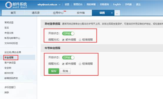 郵箱主界面,點擊【設(shè)置】中的【郵箱設(shè)置】,左側(cè)標(biāo)簽欄,選擇【異地登錄提醒】,把【異地登錄提醒】和【賬戶鎖定提醒】兩個開啟狀態(tài)的標(biāo)簽開啟。每次有異常登錄都會收到郵件通知和短信提醒。