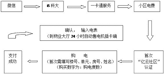 為方便廣大教職工隨時在物業(yè)購電繳費(fèi),信息與網(wǎng)絡(luò)管理中心與沁園小區(qū)物業(yè)經(jīng)過前期溝通和開發(fā),在微信端“iS科大”平臺推出了在線繳電費(fèi)功能,24小時均可在線購電(流程見下圖)。