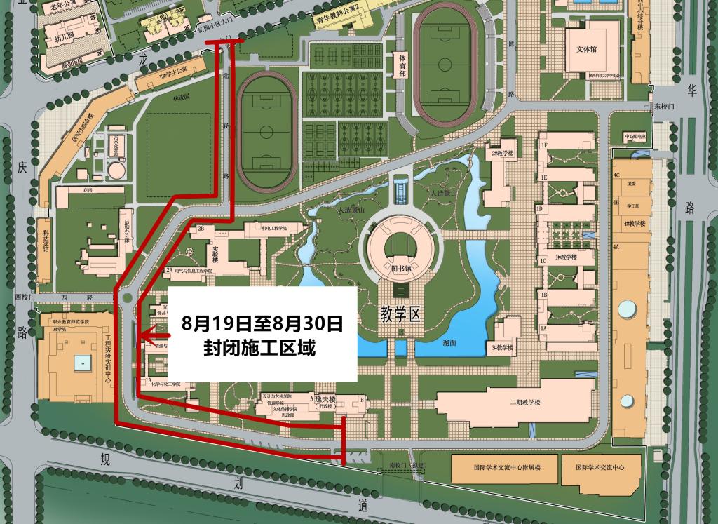 我校教學(xué)區(qū)環(huán)道維修改造工程正在緊張有序進(jìn)行,為保證施工質(zhì)量、安全,確保工程按期完工,同時盡可能減小對教學(xué)區(qū)內(nèi)車輛通行的影響,故根據(jù)工程進(jìn)度,現(xiàn)將8月19日至8月30日封閉施工的區(qū)域公布如下: