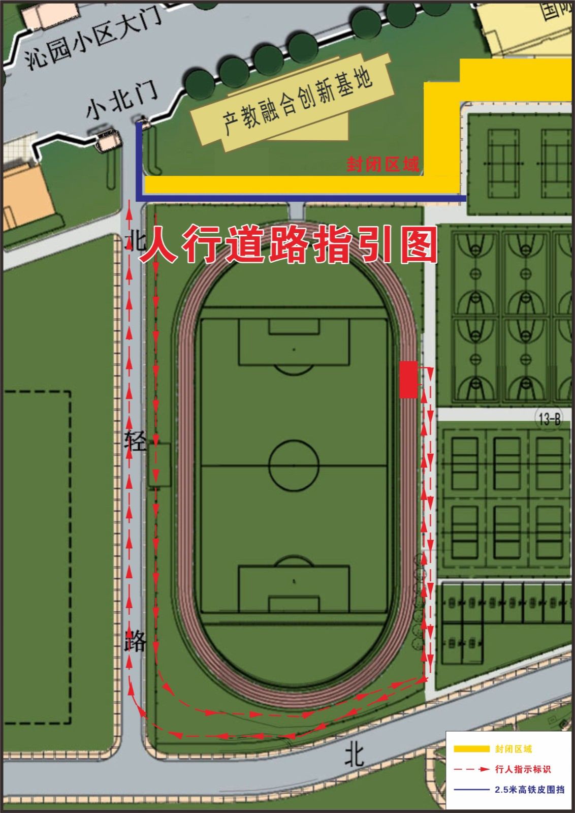 封閉期間,進(jìn)出足球場需臨時(shí)繞行至球場東入口;從封閉口西端前往餐廳需經(jīng)北輕路、北環(huán)路臨時(shí)繞行校區(qū)足球場東側(cè)道路。(詳見繞行指示圖)