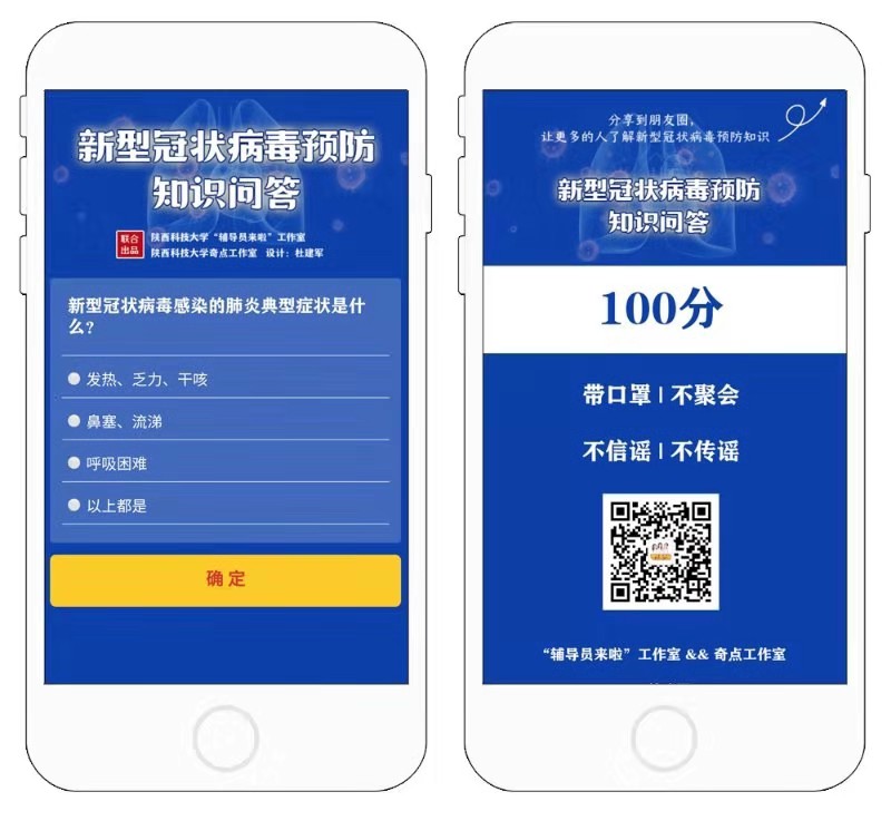校黨委書記在第三次疫情防控工作專題會議強調,要加強信息發(fā)布,做好校園輿情應對工作,加強對師生的教育引導。學校利用官方網站、微博、微信公眾號、各級工作群等發(fā)布疫情防控知識普及、致全體師生和學生家長的倡議書,及時向師生員工和學生家長宣傳普及疫情防治知識和防控要求,引導大家加強自我防護、積極面對疫情,齊心協(xié)力做好疫情防控工作。1月22日起,《今天,你戴口罩了么?》《陜西科技大學新型冠狀病毒感染的肺炎防控倡議書》《我是陜科大人,我承諾:》《關于新型冠狀病毒肺炎,你必須要知道的事實》等圖文宣傳在校園媒體矩陣不斷發(fā)布;2月1日,設置“中央精神”“科大要聞”“通知公告”“防控知識”等欄目的陜科大新型冠狀病毒感染的肺炎防控專題網站正式上線,與此同時,學工部易班中心、學工部官方微信公眾號推出《輔導員傳你病毒不侵大法》《這個假期,我承諾》《袍澤同行,必勝疫情》等多篇網文,呼吁和倡導全校師生員工主動投身疫情防疫戰(zhàn),充分發(fā)揮了強有力的正面引導作用。