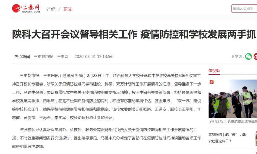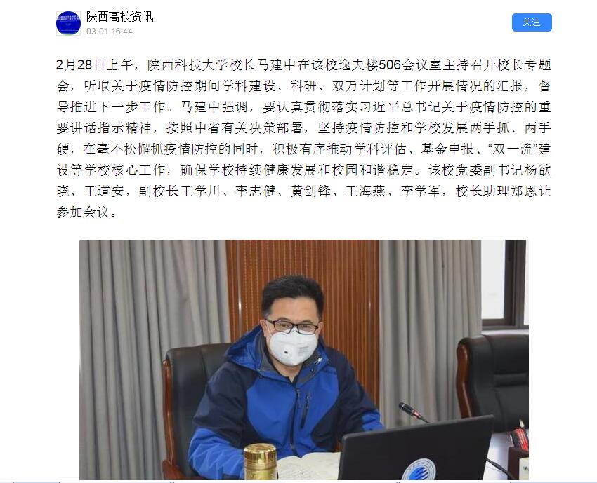 澎湃新聞客戶端:陜科大召開會(huì)議督導(dǎo)相關(guān)工作 疫情防控和學(xué)校發(fā)展兩手抓