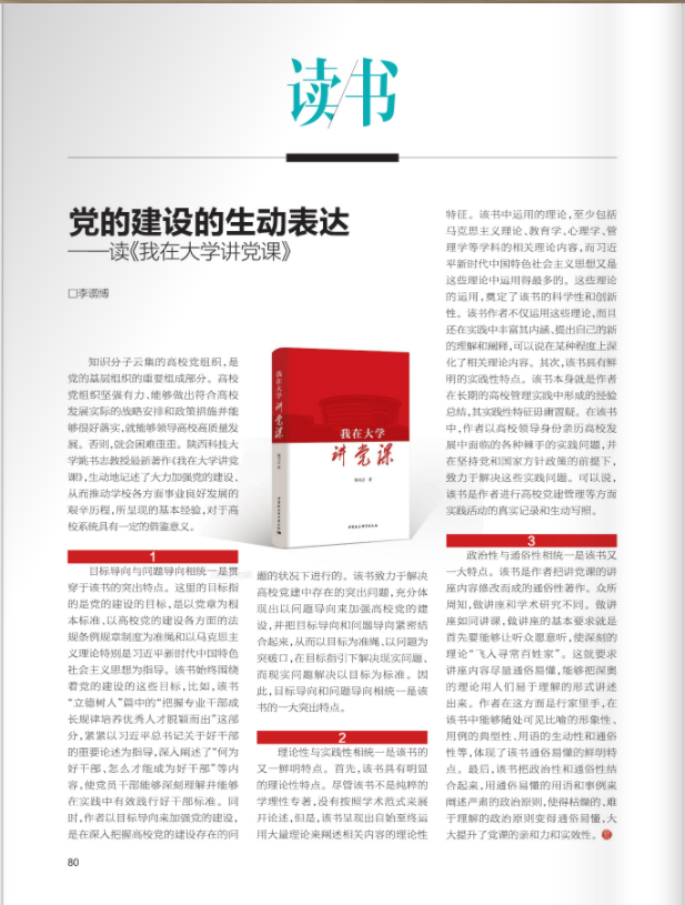 當(dāng)代陜西:黨的建設(shè)的生動(dòng)表達(dá)——專家學(xué)者評(píng)我校黨委書(shū)記姚書(shū)志專著《我在大學(xué)講黨課》