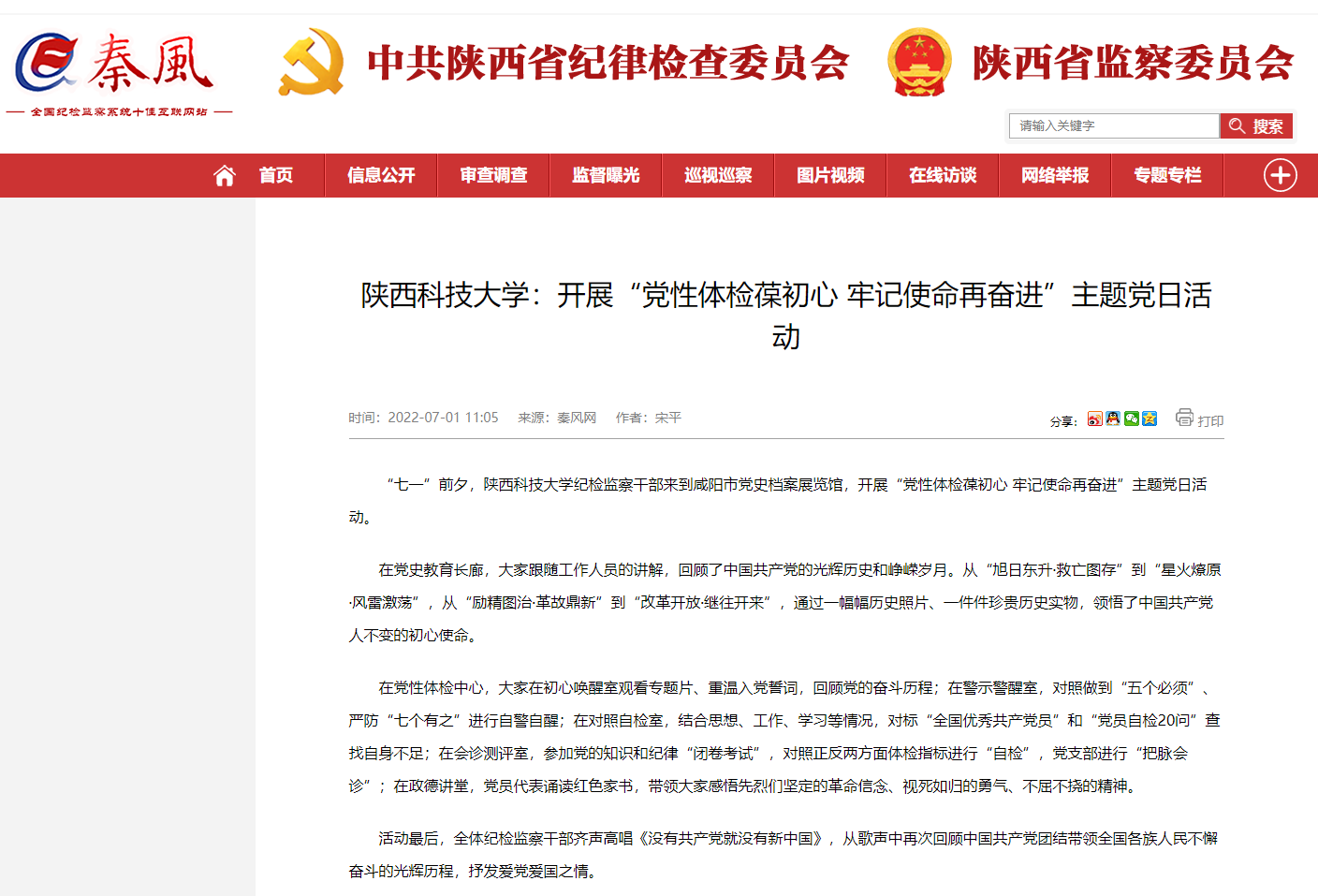 近日,秦風(fēng)網(wǎng)報(bào)道我校開展“黨性體檢葆初心 牢記使命再奮進(jìn)”主題黨日活動(dòng)。