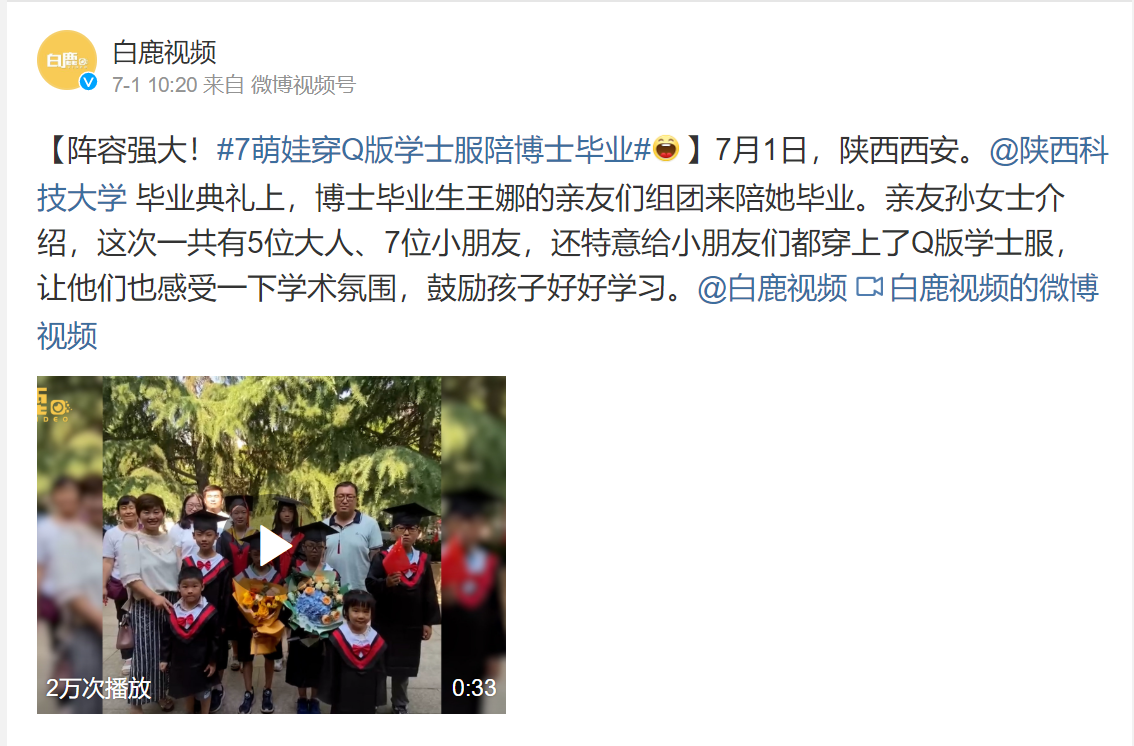 近日,白鹿視頻新浪微博賬號(hào)報(bào)道7萌娃穿Q版學(xué)士服陪我校博士畢業(yè)生王娜畢業(yè)。