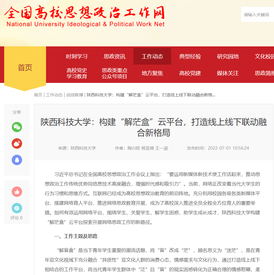 全國高校思想政治工作網(wǎng):陜西科技大學(xué):構(gòu)建“解茫盒”云平臺,打造線上線下聯(lián)動融合新格局