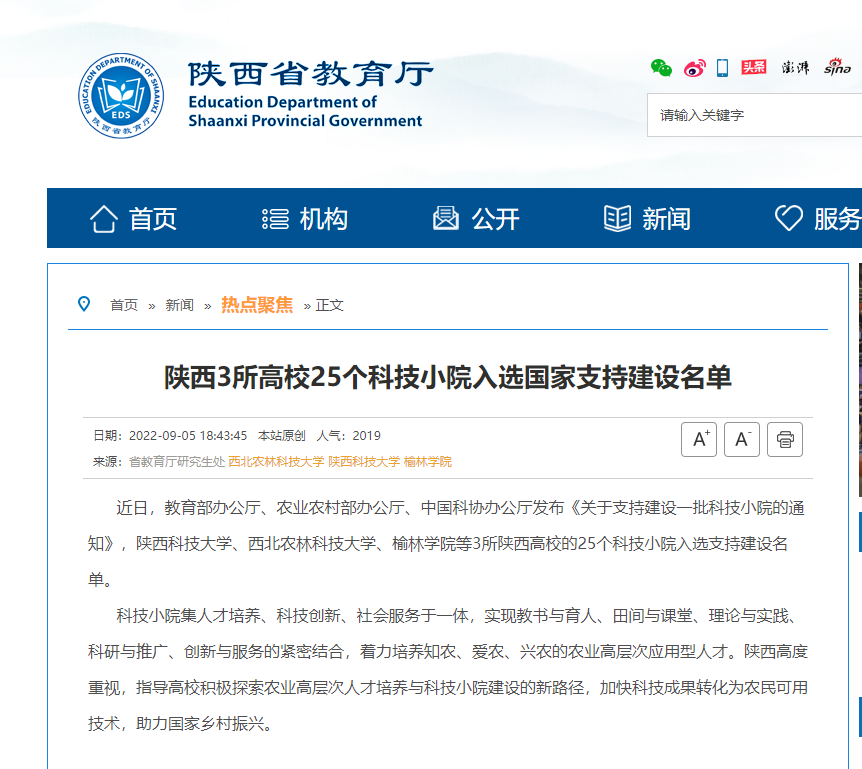 近日,陜西省教育廳官網(wǎng)、西安發(fā)布報(bào)道我??萍夹≡喝脒x選國家支持建設(shè)科技小院名單。