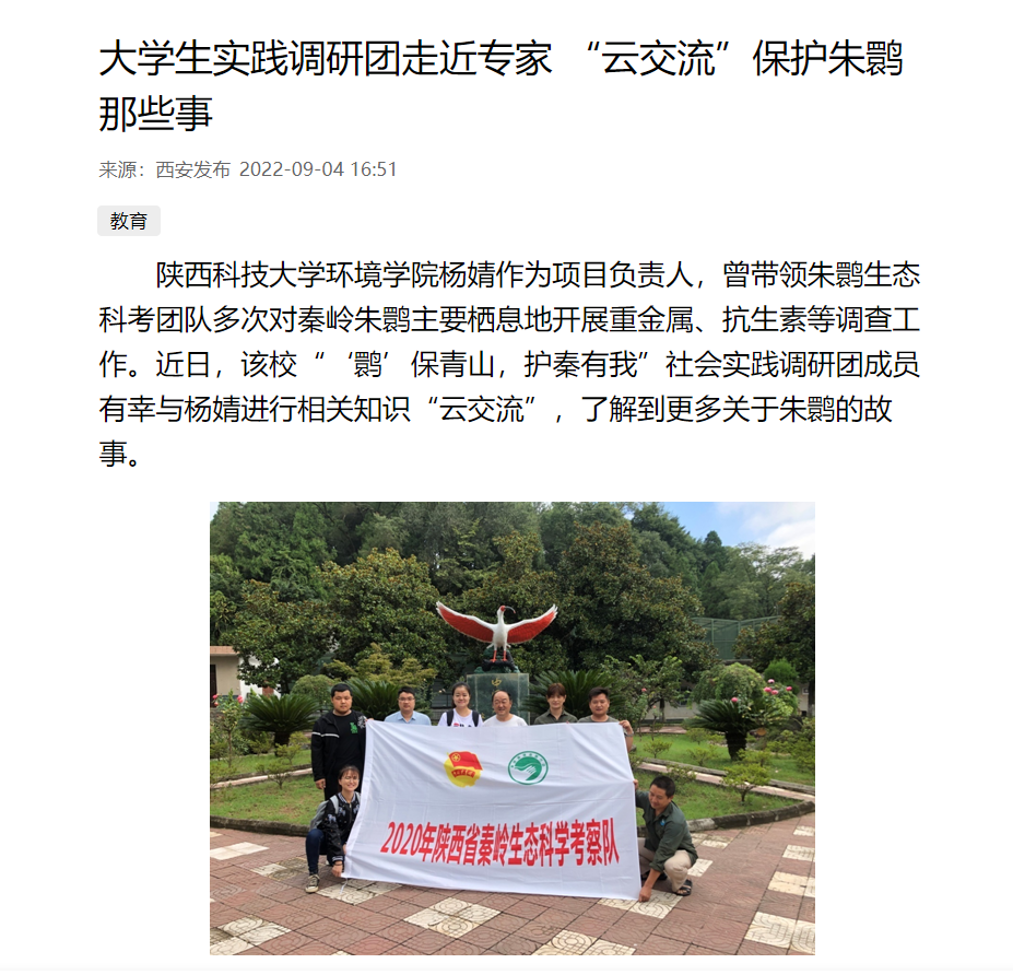 近日,西安發(fā)布、西安新聞網(wǎng)報(bào)道我校大學(xué)生實(shí)踐調(diào)研團(tuán)走近專家 “云交流”保護(hù)朱鹮那些事。