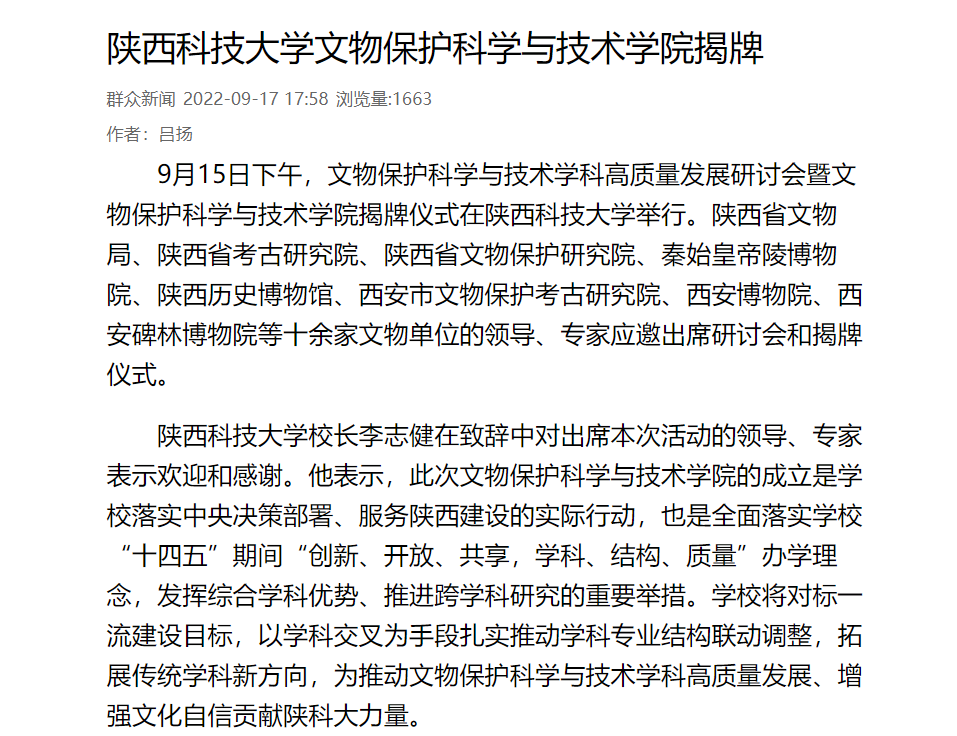 群眾新聞:陜西科技大學文物保護科學與技術學院揭牌