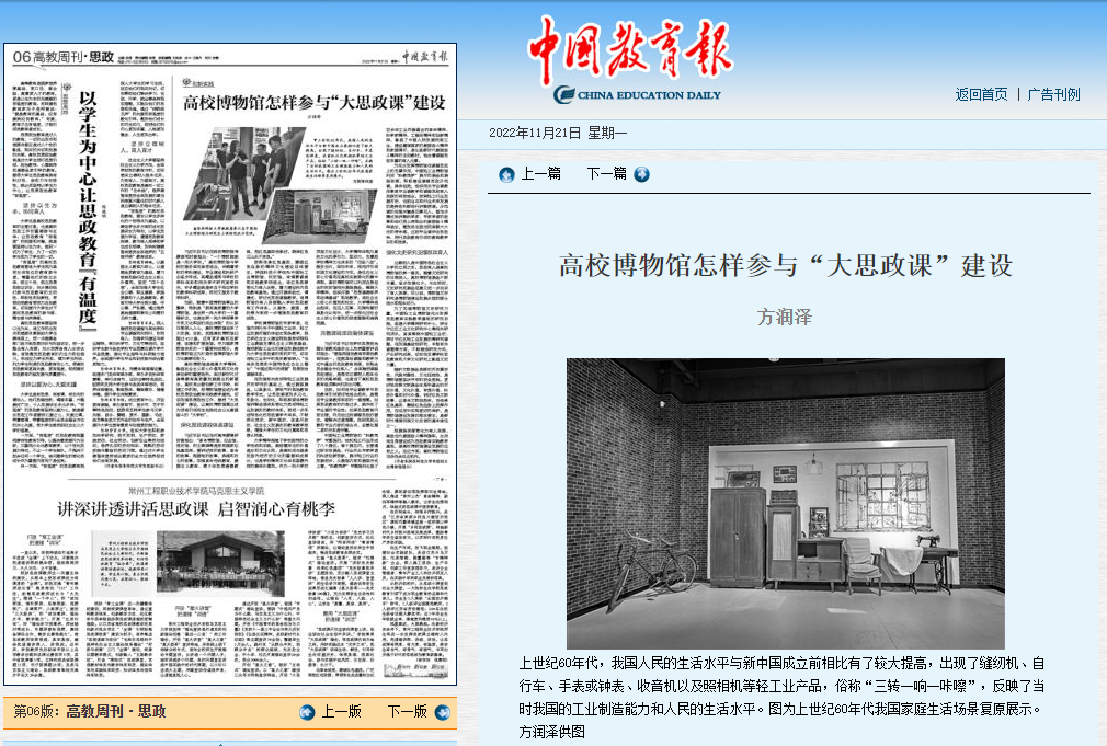 《中國(guó)教育報(bào)》11月21日“高教周刊·思政”刊發(fā)我校中國(guó)輕工業(yè)博物館館長(zhǎng)方潤(rùn)澤署名文章《高校博物館怎樣參與“大思政課”建設(shè)》。