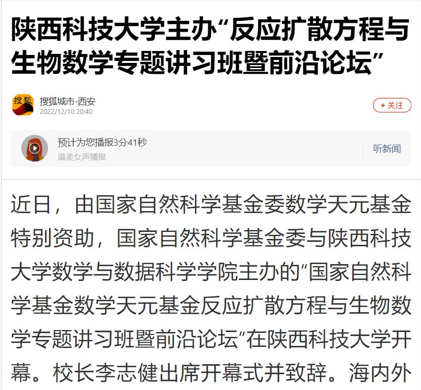 搜狐新聞:陜西科技大學主辦“反應擴散方程與生物數學專題講習班暨前沿論壇”