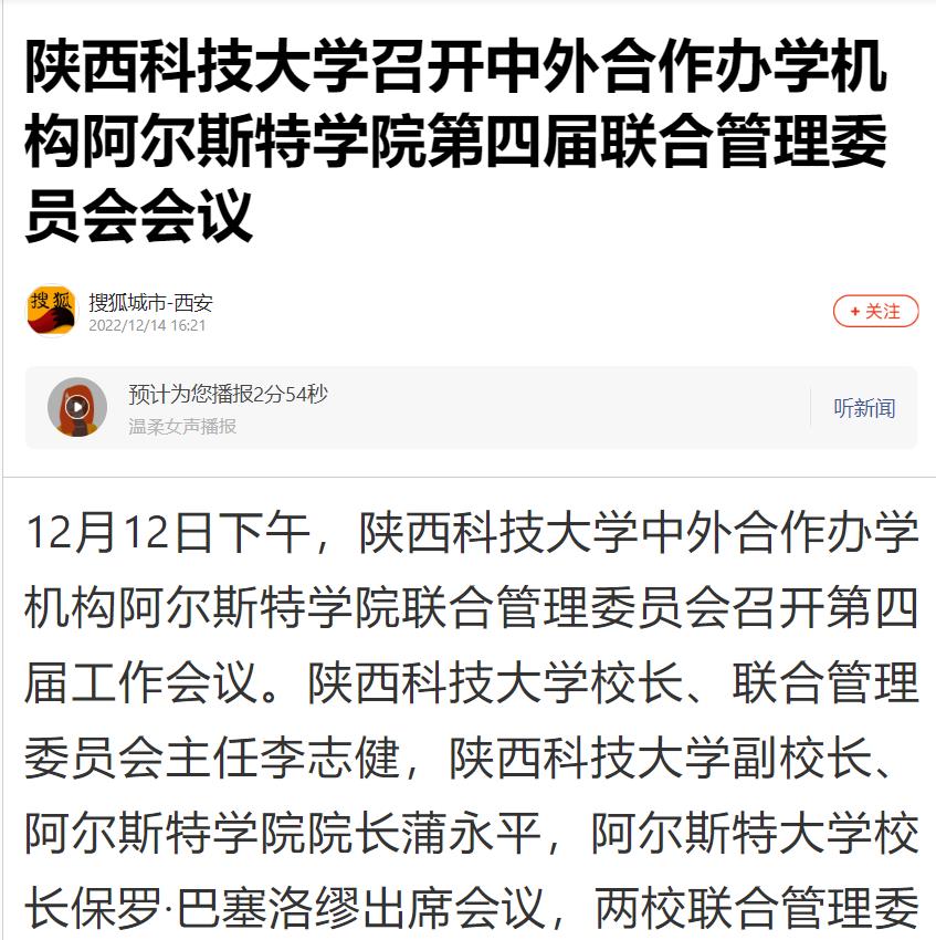 搜狐新聞:陜西科技大學(xué)召開中外合作辦學(xué)機(jī)構(gòu)阿爾斯特學(xué)院第四屆聯(lián)合管理委員會會議