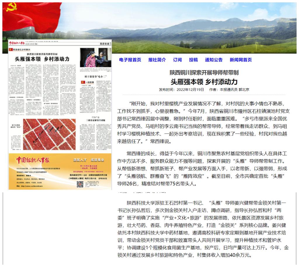 近日,《中國(guó)組織人事報(bào)》報(bào)道我校派駐王石凹村第一書記、“頭雁”導(dǎo)師姜興健幫帶產(chǎn)業(yè)發(fā)展事跡。
