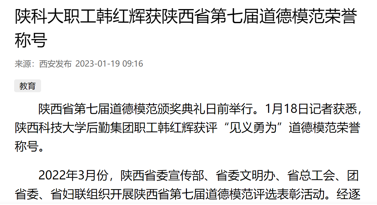 西安發(fā)布:陜科大職工韓紅輝獲陜西省第七屆道德模范榮譽(yù)稱號