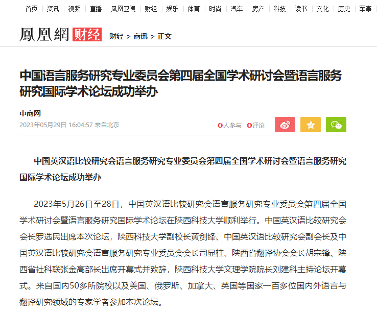 鳳凰網(wǎng):中國(guó)語(yǔ)言服務(wù)研究專業(yè)委員會(huì)第四屆全國(guó)學(xué)術(shù)研討會(huì)暨語(yǔ)言服務(wù)研究國(guó)際學(xué)術(shù)論壇成功舉辦
