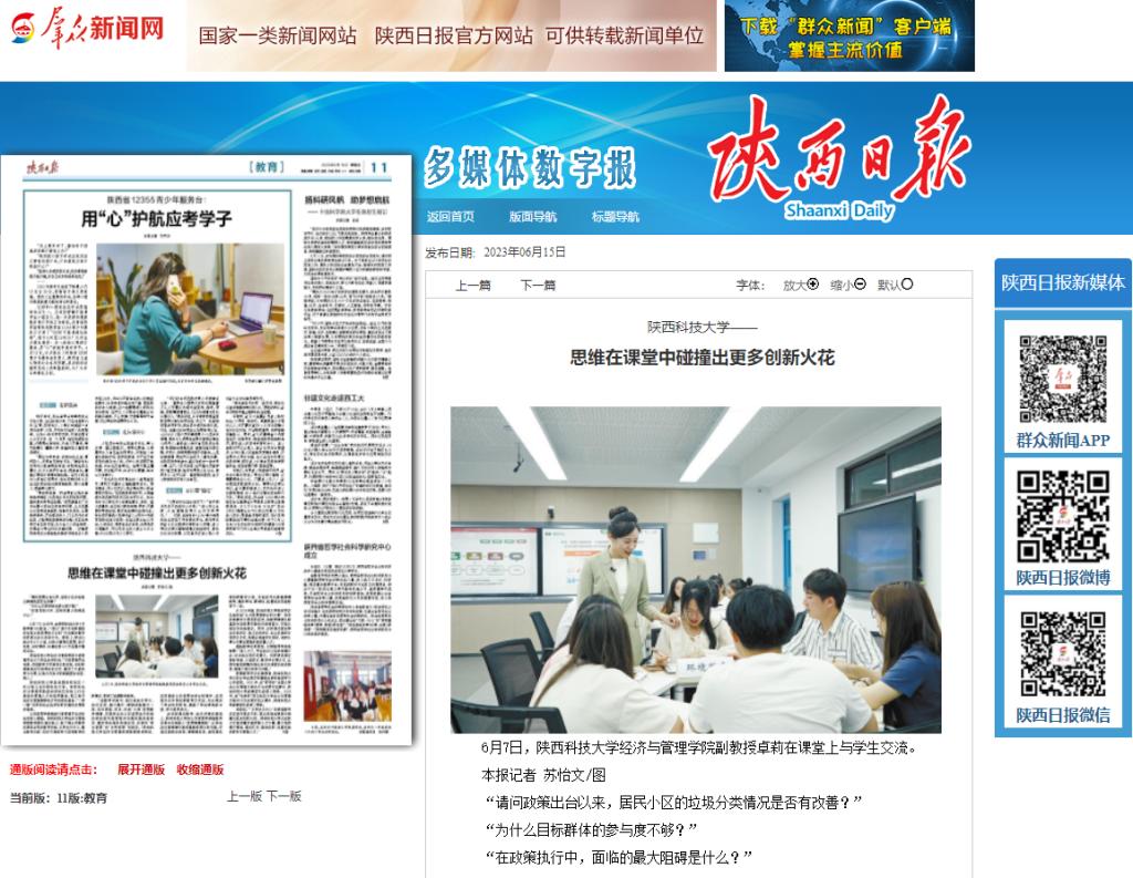 近日,《陜西日報》報道我校教學(xué)創(chuàng)新課堂讓思維在課堂中碰撞出更多創(chuàng)新火花。