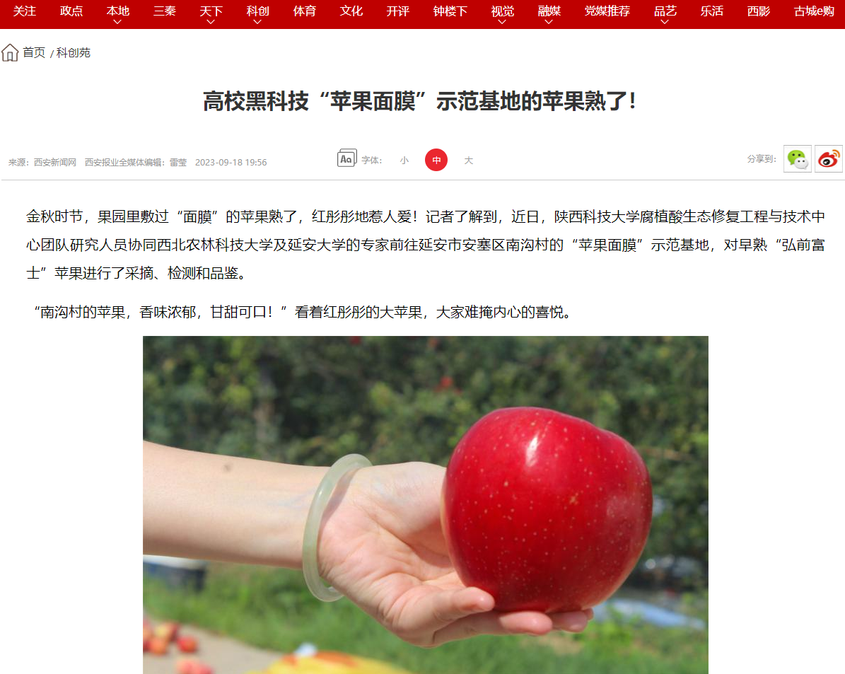 近日,西安新聞網(wǎng)報道我校黑科技“蘋果面膜”示范基地的蘋果熟了。