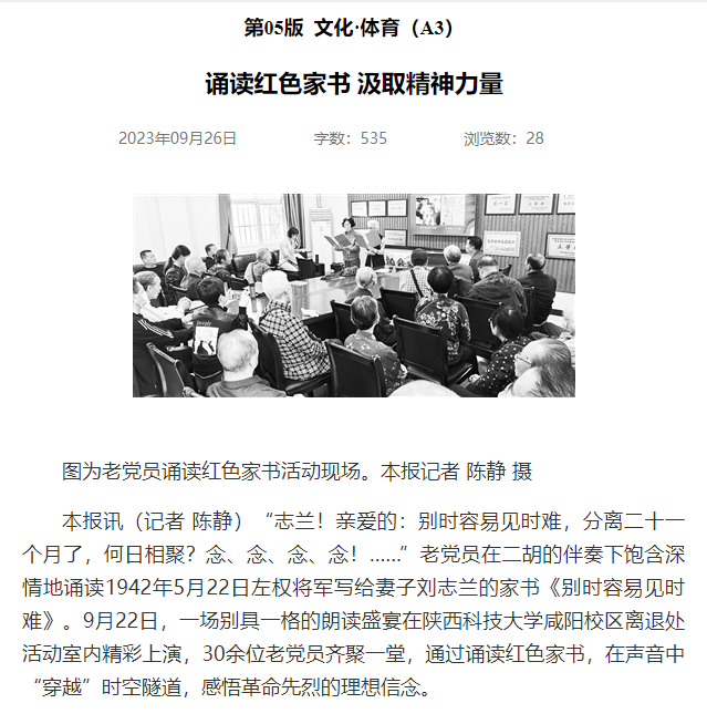 近日,《咸陽日?qǐng)?bào)》報(bào)道我校離退處舉辦誦讀紅色家書活動(dòng)。