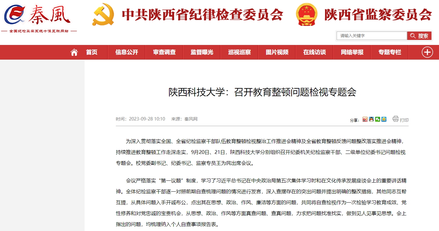 近日,秦風(fēng)網(wǎng)報(bào)道我校召開(kāi)教育整頓問(wèn)題檢視專(zhuān)題會(huì)。