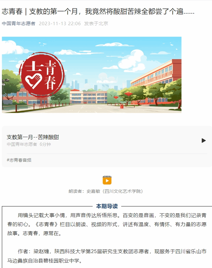 近日,“中國(guó)青年志愿者”微信公眾號(hào)報(bào)道我校第25屆研究生支教團(tuán)志愿者的志愿故事。