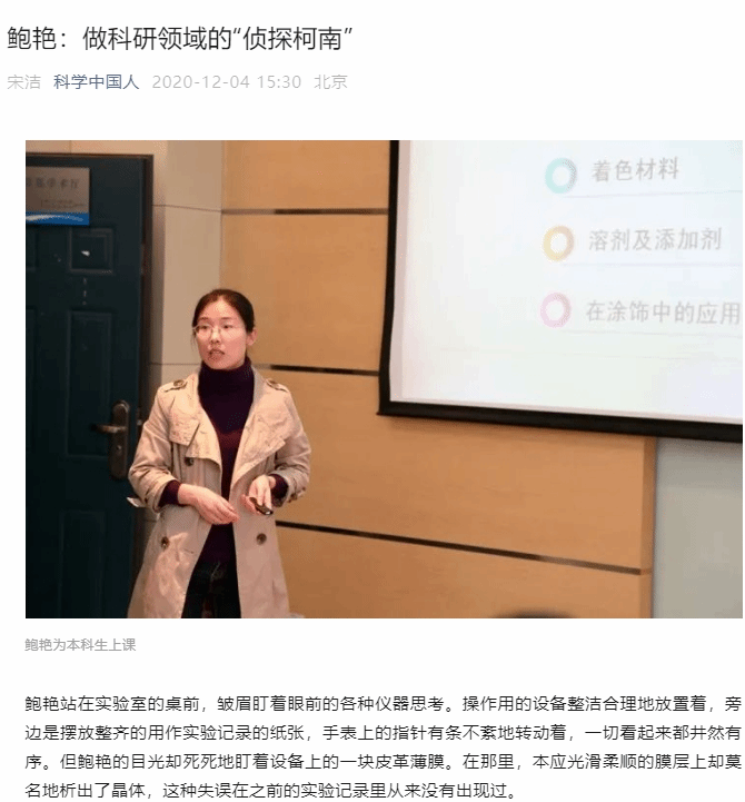 近日,《科學(xué)中國人》官方微信公眾號報(bào)道我校鮑艷教授做科研領(lǐng)域的“偵探柯南”。
