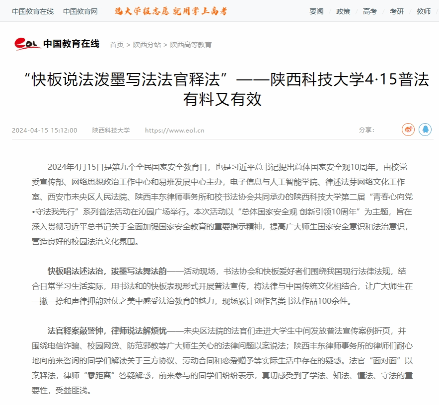 中國(guó)教育在線:“快板說(shuō)法潑墨寫法法官釋法”——陜西科技大學(xué)4·15普法有料又有效