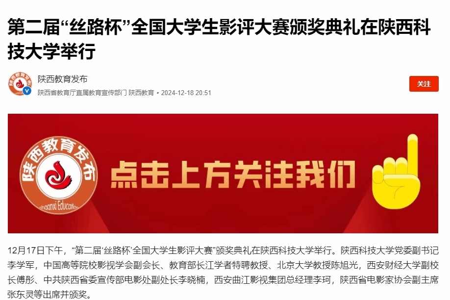 搜狐新聞:第二屆“絲路杯”全國(guó)大學(xué)生影評(píng)大賽頒獎(jiǎng)典禮在陜西科技大學(xué)舉行