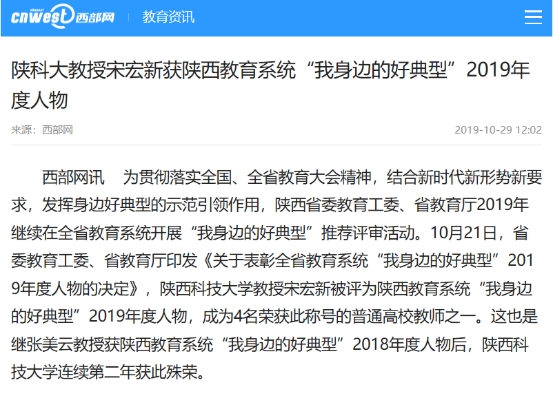 10月29日,《西部網(wǎng)》報道了我校教師宋宏新教授獲陜西教育系統(tǒng)“我身邊的好典型”2019年度人物,全文鏈接如下:http://m.cnwest.com/jyzx/a/2019/10/29/18118402.html