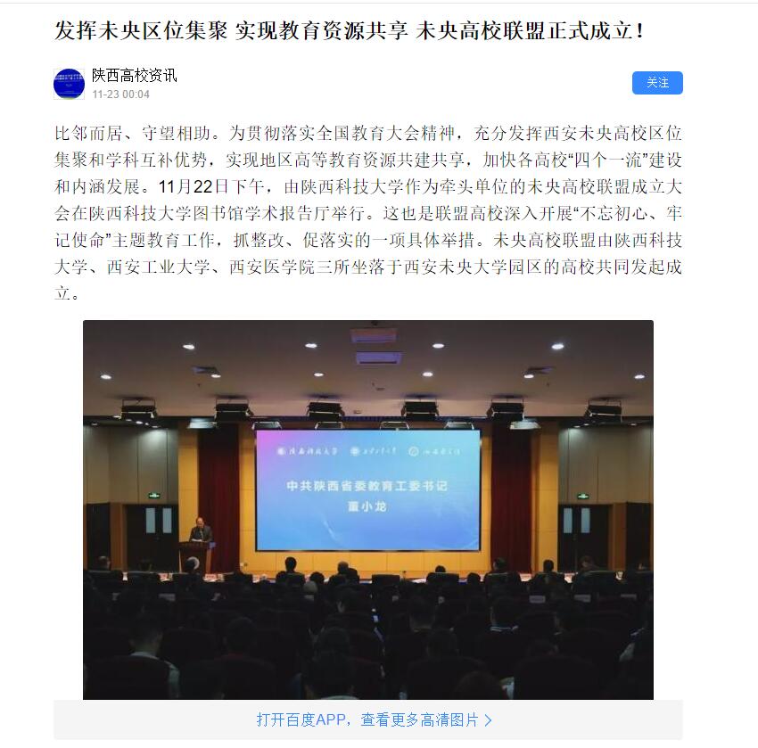 百度APP:發(fā)揮未央?yún)^(qū)位集聚 實(shí)現(xiàn)教育資源共享 未央高校聯(lián)盟正式成立!